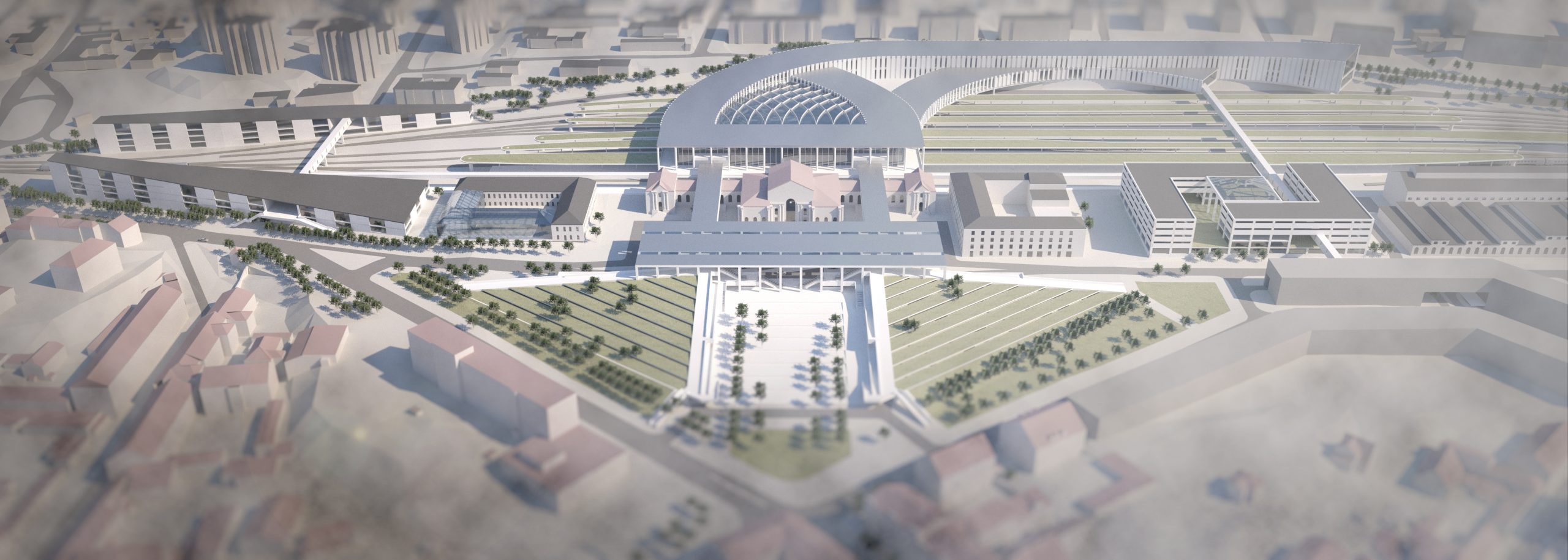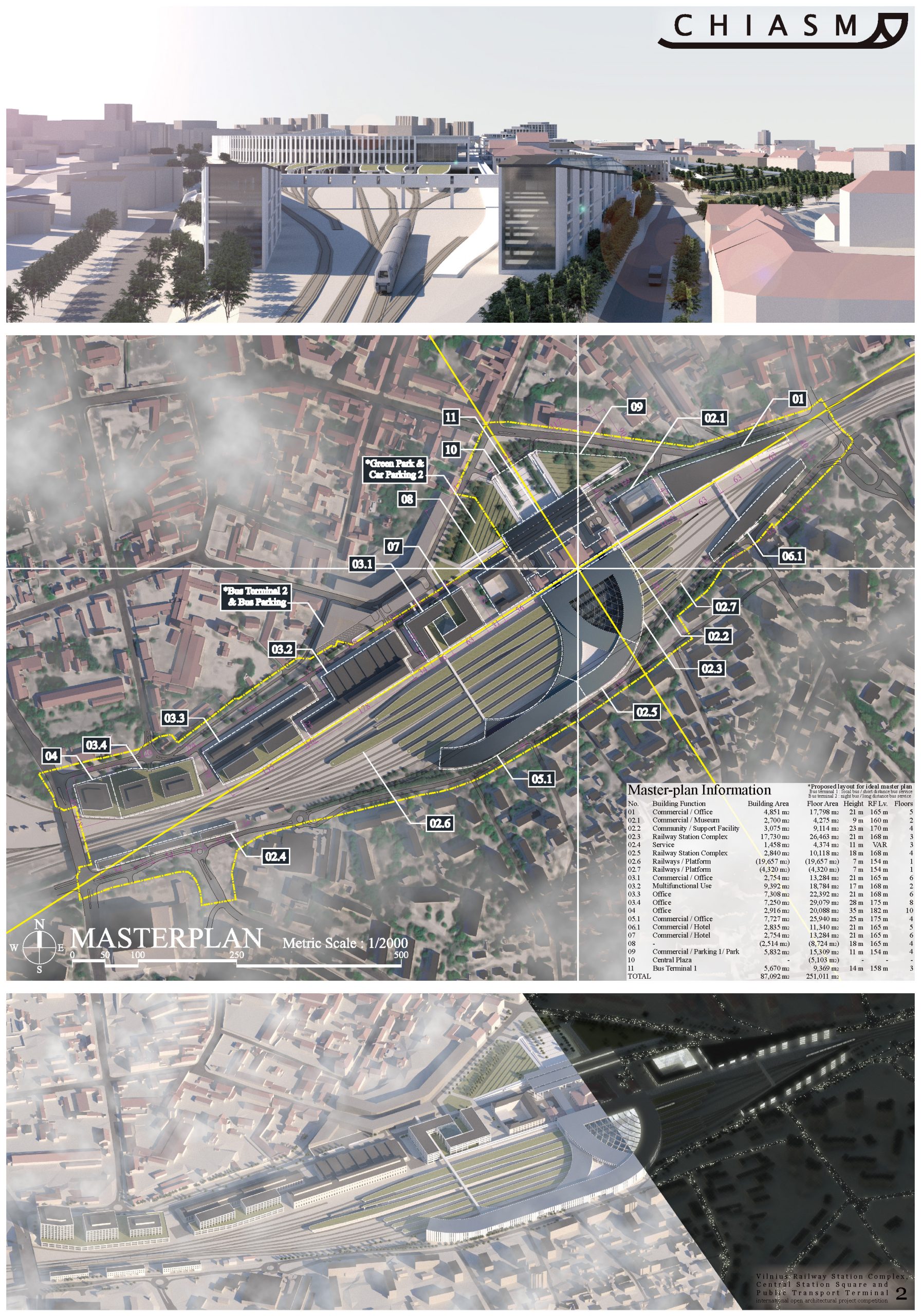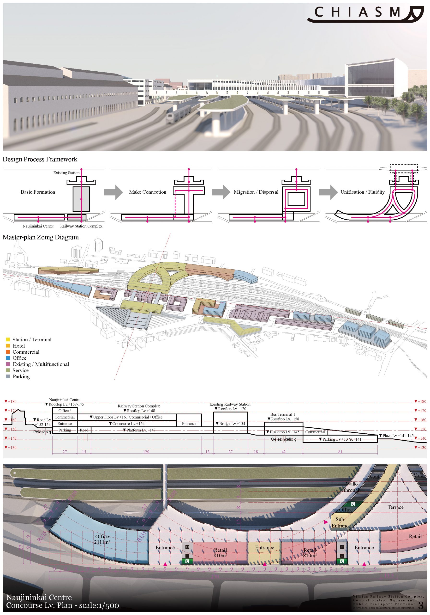 In this proposal, it re-evaluates the original design of the station forecourt that the orthogonal axis of the railway is the main approach from the north-west direction, both wings are green park which consists symmetrical configuration.