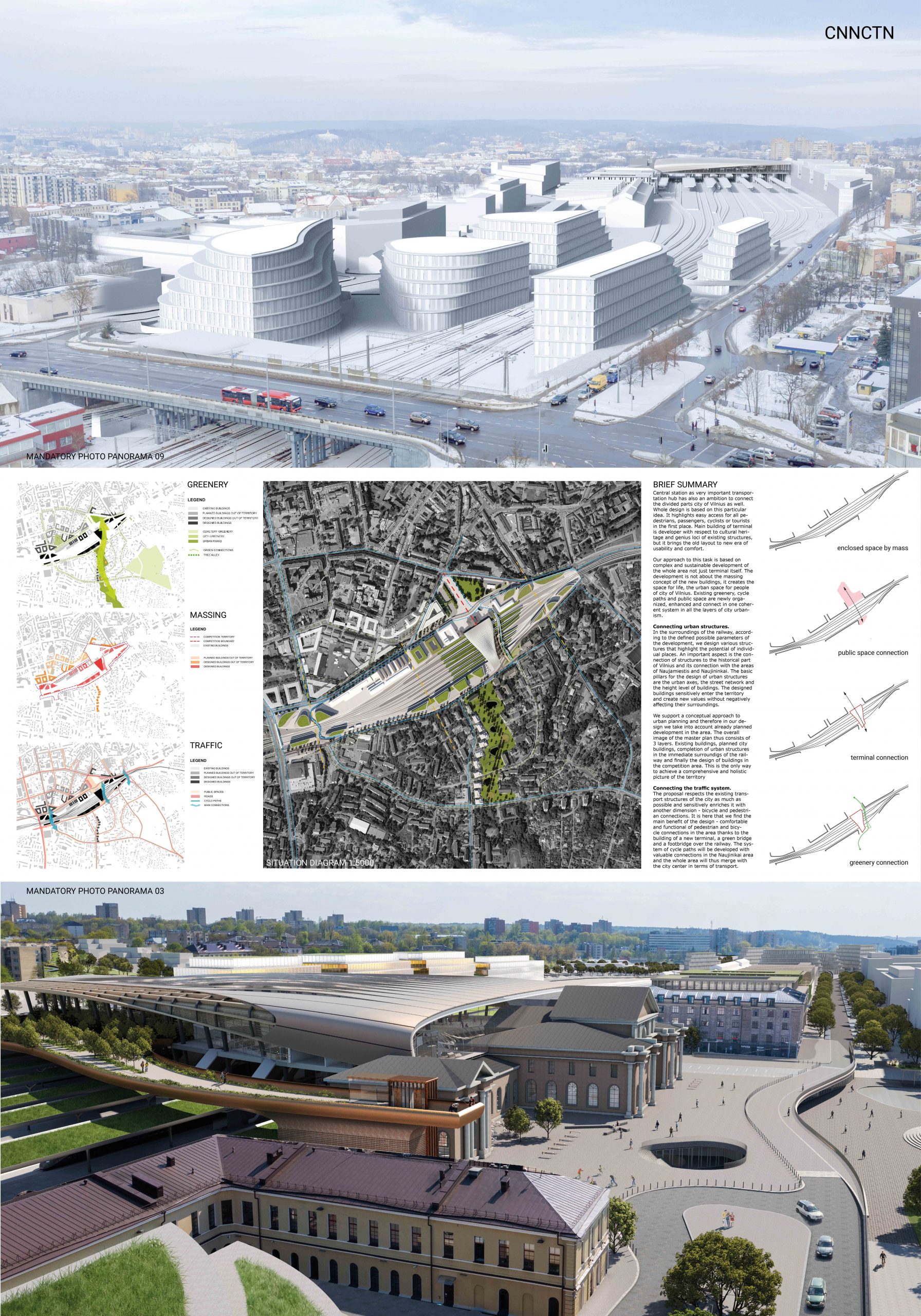 Central station as very important transportation hub has also an ambition to connect the divided parts city of Vilnius as well. Whole design is based on this particular idea. It highlights easy access for all pedestrians, passengers, cyclists or tourists in the first place. Main building of terminal is developer with respect to cultural heritage and genius loci of existing structures, but it brings the old layout to new era of usabilityand comfort.