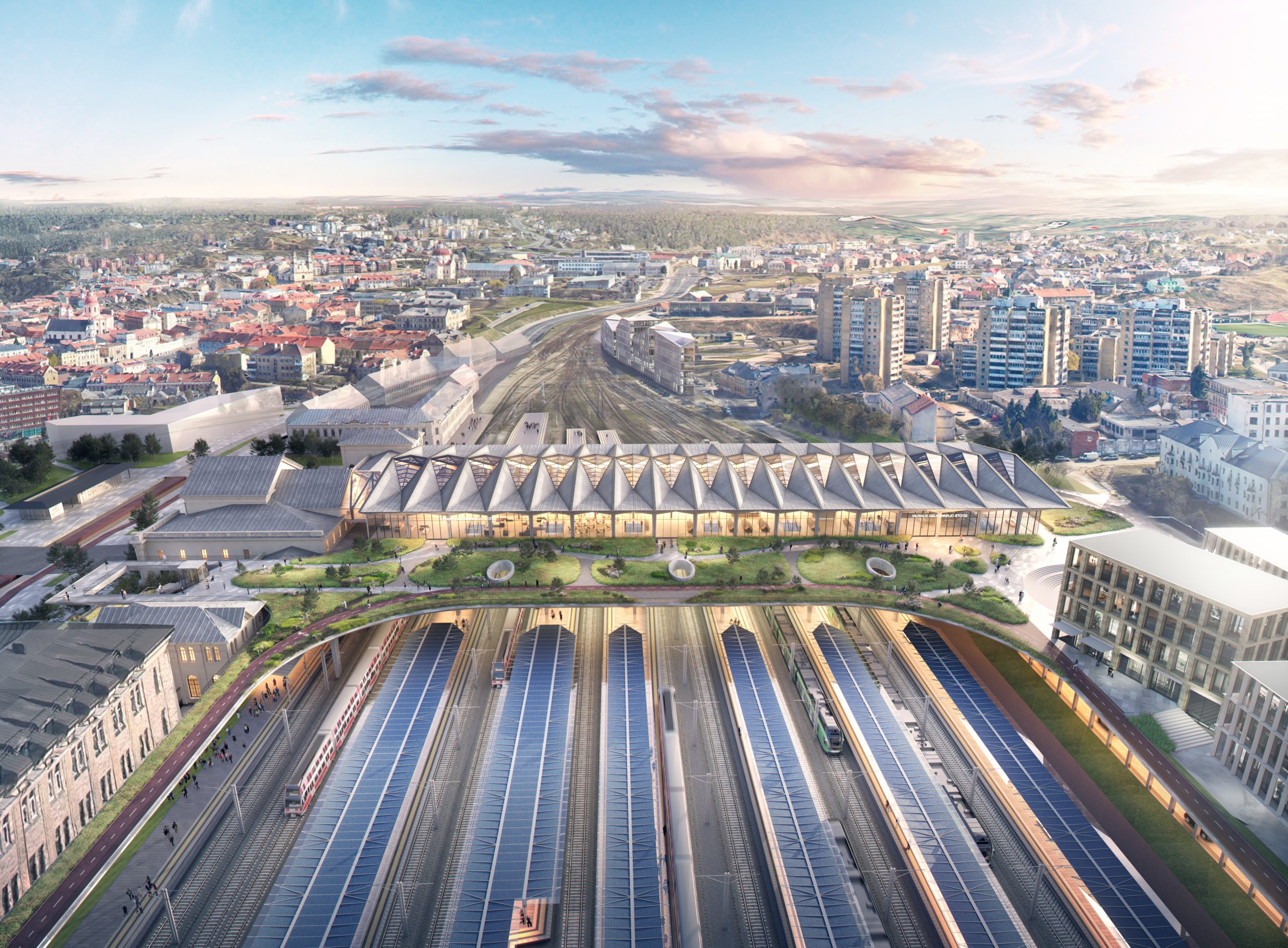 The fairly simple new terminal volume is sitting on a green hill that organically stretches out over the tracks providing an easy access for all.